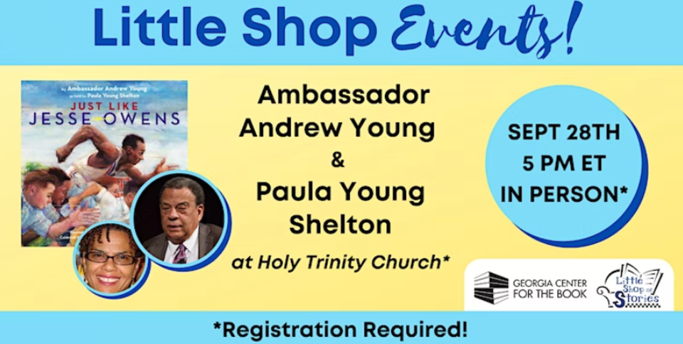 Little Shop of Stories & Georgia Center for the Book is excited and honored to host civil rights icon Ambassador Andrew Young and his daughter, Paula Young Shelton! They will discuss their new book, JUST LIKE JESSE OWENS - a rich oral history about a special day in Andrew's childhood that forever changed him. This story of race relations in the 1930s South is soon a classic picture book!