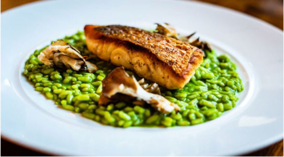 The juicy fish sits on the bed of beaming green risotto, making the dish extraordinary.