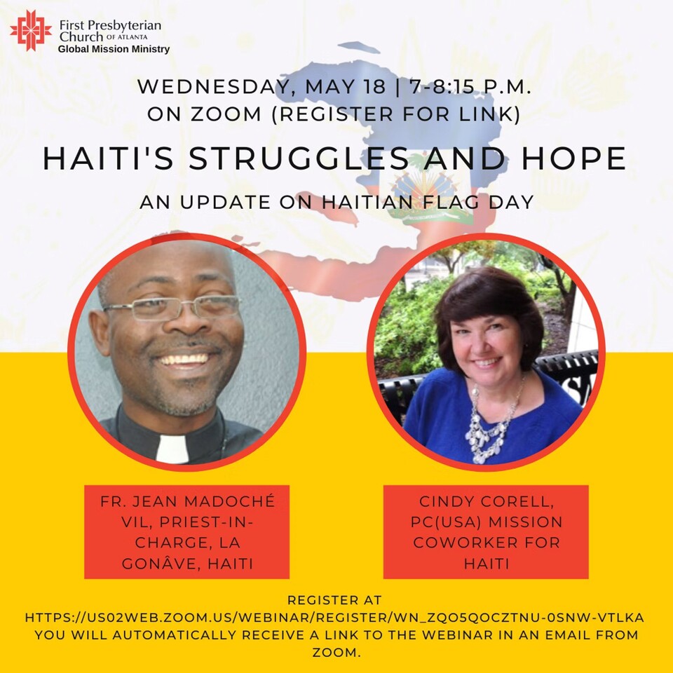 In a Facebook post on Thursday, May 12, the First Presbyterian Church of Atlanta has encouraged the public to join PCUSA Mission Coworker Cindy Corell and Fr. Jean Madoché Vil as they discuss resilience and strength of Haiti's people.