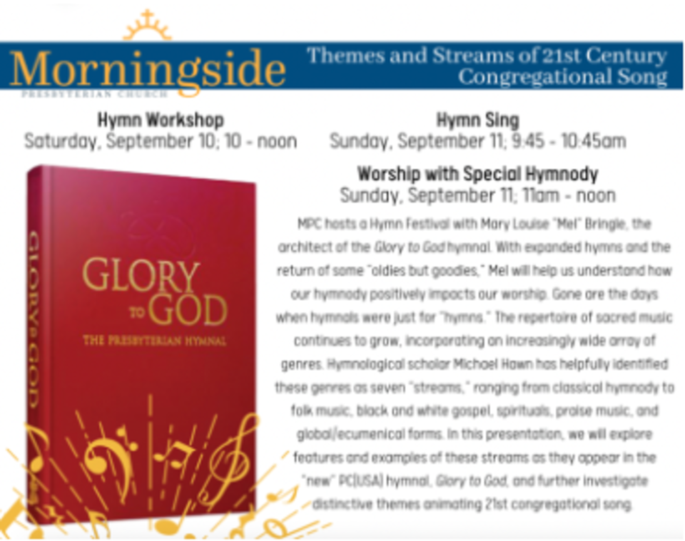Morningside Presbyterian Church said the presentation will explore features and examples of these streams as they appear in the “new” PC(USA) hymnal, Glory to God, and further investigate distinctive themes animating the 21st congregational song.