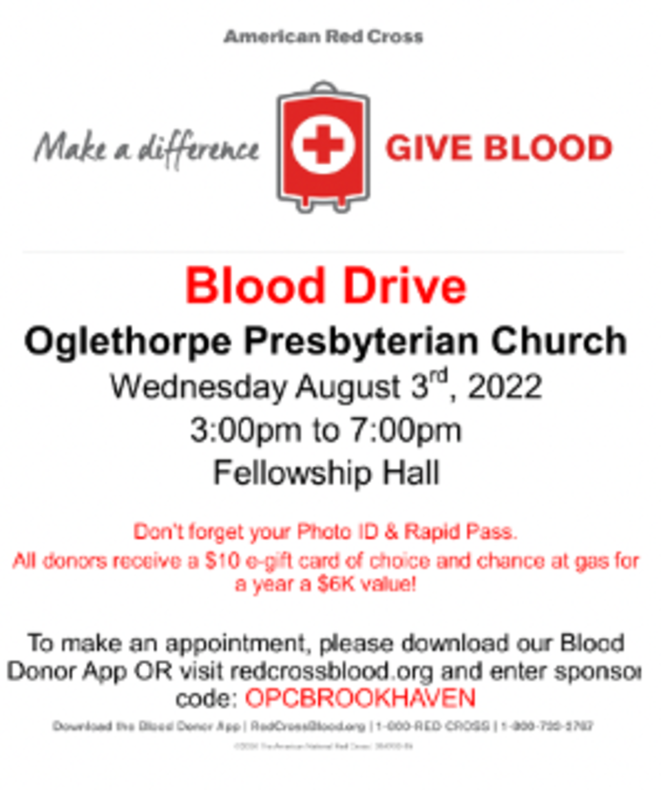 Oglethorpe Presbyterian Church said they may make appointments, then download blood donor applications. Another, they may also visit redcrossblood.org and enter sponsor code: OPCBROOKHAVEN.