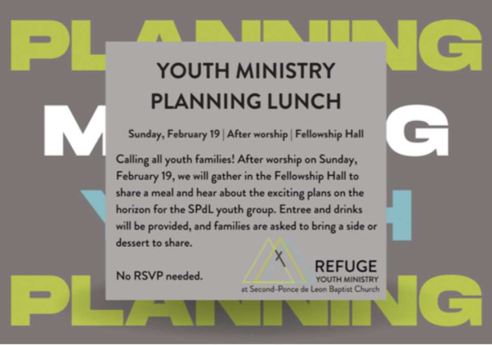 Second-Ponce De Leon Baptist Church (SPDL) will hold a youth ministry planning lunch on Sunday, Feb. 19, for their youth ministry programs.