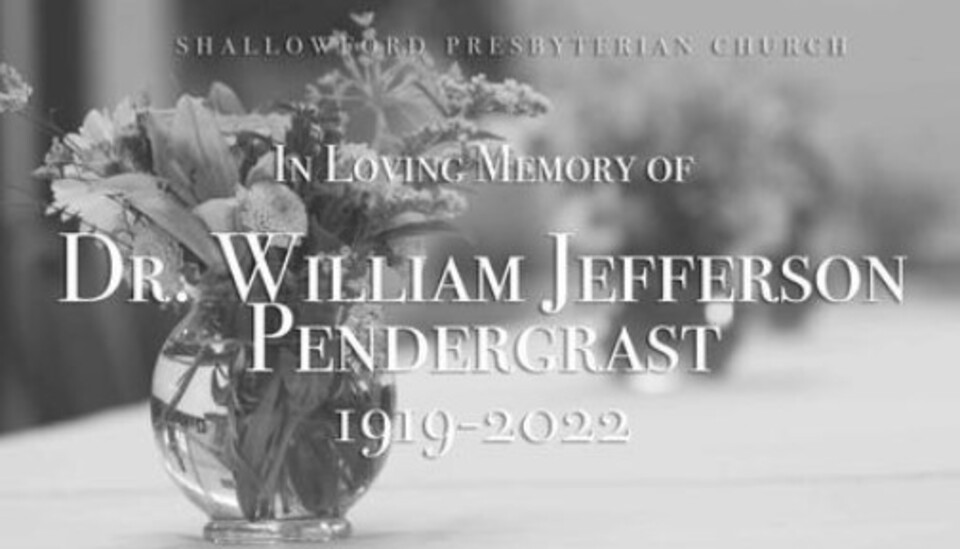 In a Facebook post on Monday, March 7, the Shallowford Presbyterian Church said Dr. William "Bill" Jefferson Pendergrast, an initial charter member of Shallowford church, was honored in a memorial service.