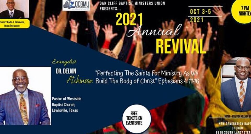 "Join us from 7-9 PM, for our 2021 Annual Revival, with Guest Evangelist, Dr. Delvin Atchinson, Pastor of Westside Baptist Church