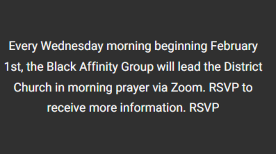 Every Wednesday morning beginning February 1st, the Black Affinity Group will lead the District Church in morning prayer via Zoom. RSVP to receive more information.
