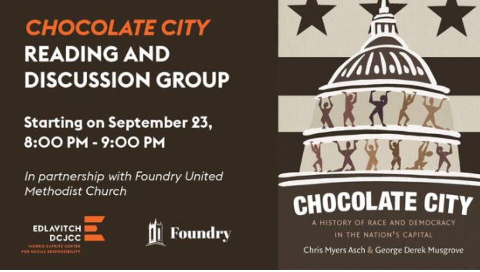 Foundry is partnering with our neighbors at The Edlavitch DCJCC for a series of events surrounding the book Chocolate City: A History of Race and Democracy in our Nation's Capital by Chris Myers Asch and George Derek Musgrove. In September, join a reading group with other Foundry community members as we take a deep dive into the history of our neighborhoods, city, and region through a reading of Chocolate City over the course of a few months. As we learn together, we’ll pay particular attention to the role of local faith communities in organizing, participating in, or stifling the many local and national political battles which have played out in our streets.