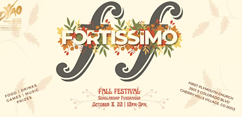 DYAO is proud to announce the First Annual FORTISSIMO: Fall Festival, presented by the Genessee Mountain Foundation. Join us October 8, 2022 from 12pm-3pm in the parking lot of First Plymouth Church for food and fun, live music from DYAO young artists, as well as games and prizes ! Proceeds from the event will support DYAO scholarship efforts.
