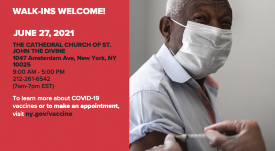 In partnership with Governor Cuomo and the New York State Department of Health, the Cathedral will host a COVID-19 pop-up vaccination site on Sunday, June 27 from 9a - 5p. The Cathedral will be open for walk-in vaccinations for individuals over the age of 18 and there is no appointment or insurance required. Healthcare providers will administer free doses of the Johnson & Johnson vaccine to anyone who wishes to receive one.