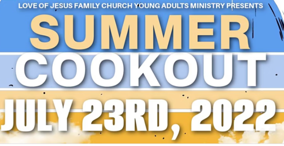 We invite you to our “Summer Cookout” at the love of Jesus family church. A summer cookout is a free event with food, music, and games. Come with your friends and wear your best fit! We can’t wait to see you there!