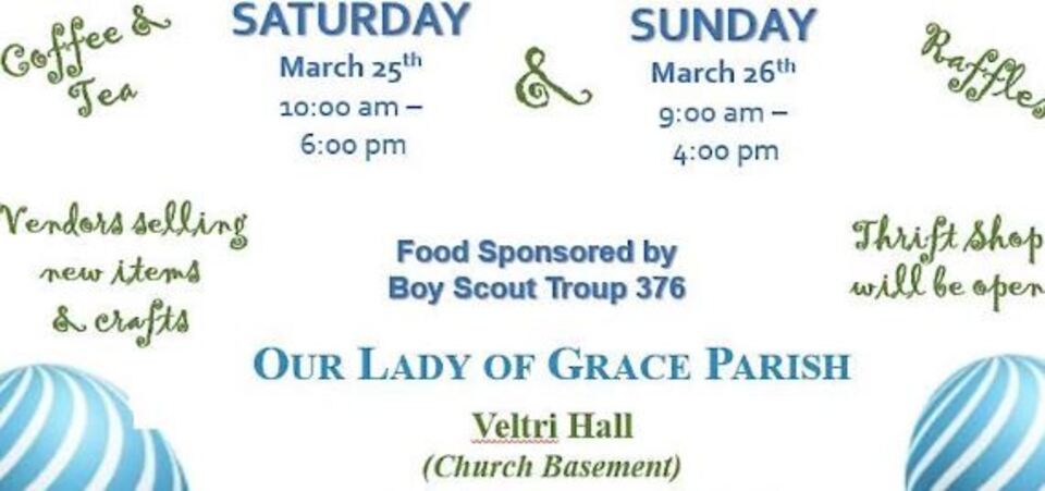 Please join u us for Our Lady of Grace Easter Fair Vendors selling new items and crafts Sponsors: Boy Scout Troop 376 & Girl Scout Troop 673
