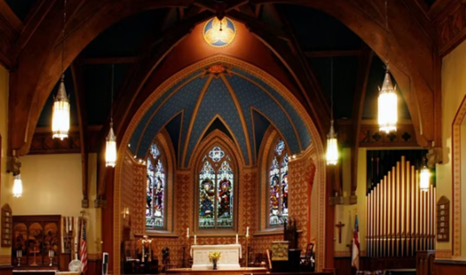 Richard M. was the son of renowned ecclesiastical architect Richard Upjohn, architect of Trinity Church Wall Street, who worked primarily with the Gothic Revival style. The interior features exposed wood roof trusses, polychrome tile floor, carved wood trim, and stenciling on the chancel walls. The church has long-standing connections with City dignitaries, with a stained-glass window donated in memory of Fiorello La Guardia, and an altar rail donated by the Yankee legend Babe Ruth in memory of his teammate Lou Gehrig.