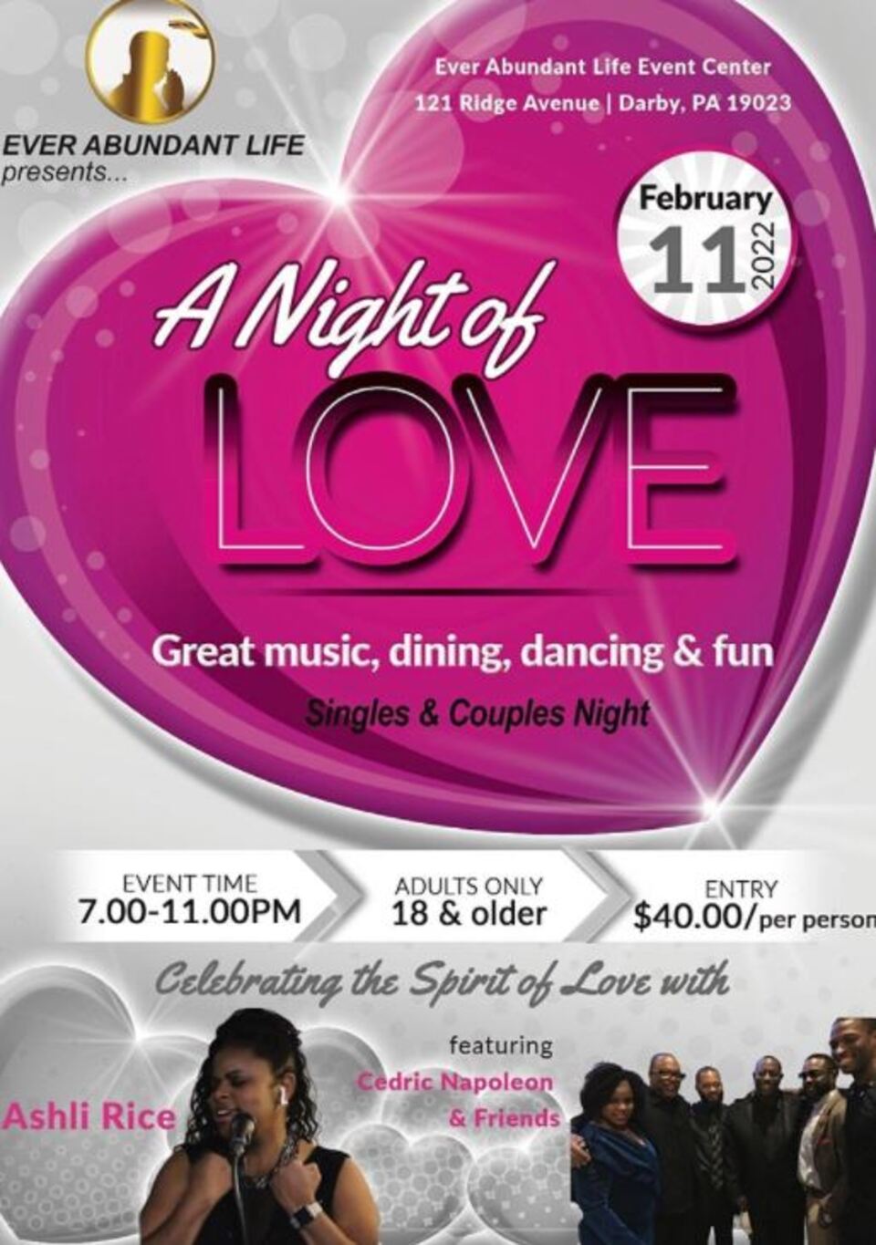 Whether married or single, we invite you to join us for great music, dinner and dancing. We're celebrating in the Spirit of Love with performances by Ashli Rice featuring Cedric Napoleon & Friends.