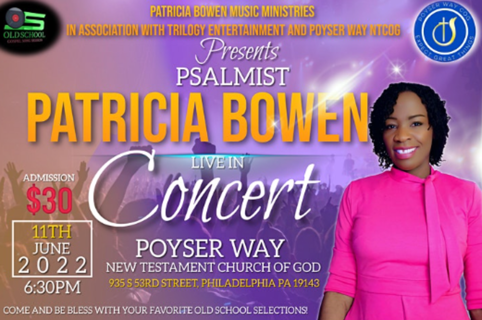 Patricia Bowen Music Ministries in association with Trilogy Entertainment and Poyser Way New Testament Church of God presents Patricia Bowen Live in Concert. Come for an evening of Blessing with Gospel sensation, recording Artiste Patricia Bowen. Hear your favorite Old Skool Gospel Music. old Skool Gospel Concert At its best! Come hear her chant your favorite sayings like.... Boom! A Whoofah Song Dis? How Yu Doing? It will be Holy Ghost Filled!