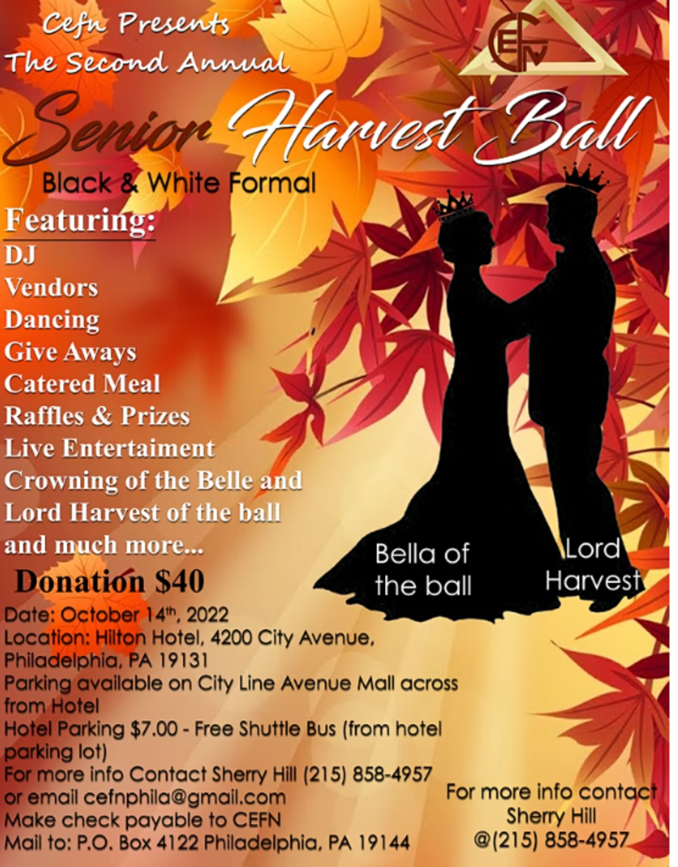 On October 14th, 2022, CEFN will be hosting its 2nd Annual Senior Gala Extravaganza: Senior Harvest Ball. Our event will feature a DJ, live entertainment, health & wellness vendors, a delicious, nutritious catered meal, dancing, giveaways, raffles, prizes, and the crowning of the Belle of the Ball and Lord Harvest. We cant wait to have a blast with each and every one of you!