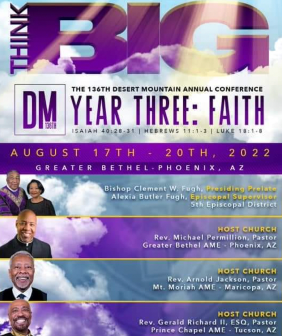 According to the church, it invited to take part in person at Greater Bethel AME Church Phoenix, Arizona, or virtually on zoom from Aug. 18 to 20, 2022, on behalf of Bishop Clement Fugh, Supervisor Alexia Fugh, Presiding Elder Theresa Nelson, and the host pastors Rev. Michael Permillion, Rev. Gerald Richard, Esq., and Rev. Arnold Jackson.