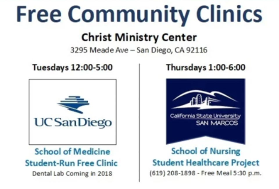 The church’s free clinic section posted that the UC San Diego (UCSD) School of Medicine Student-Run Free Clinic offers medical services on Tuesdays and Thursdays. On the other hand, the California State University San Marcos (CSUSM) Student healthcare project helps the community every Thursday.