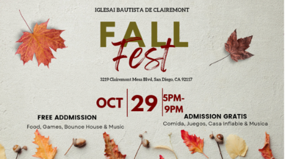 First Baptist Church Clairemont will hold Iglesia Bautista’s Fall Fest 2022 for the family and community on Saturday, Oct. 29, from 5 p.m. to 9 p.m.
