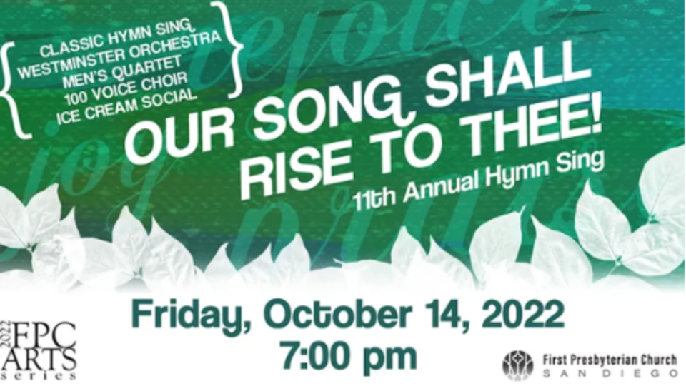 First Presbyterian Church San Diego (FPCSD) will hold the 11th Annual Hymn Sing with the theme, “Our Song Shall Rise Thee,” on Friday, Oct. 14, at 7 p.m. in the church’s sanctuary.