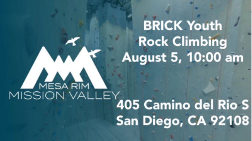 The BRICK Youth of the Point Loma Community Presbyterian Church will hold Youth Rock Climbing on Aug. 5, Friday, at Mesa Rim in Mission Valley.