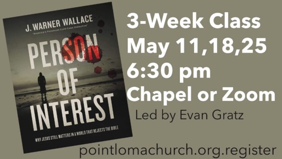 Point Loma Community Presbyterian Church holds a three-week class based on the book written by J. Warner Wallace and led by Evan Gratzon on May 11, 18, and 25 at 6:30 p.m.