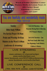 At WOF our vision is the family unit. Families come in all shapes and sizes. if you are currently a single individual, you are a family of one. If you are married with no children, you are a family of two. Some disqualify themselves from the term "family" if they don't have a spouse and/or children. At WOF we want you to know -you are a family and (if a Christian) a part of an even bigger family..the family of Christ. if not a Christian yet...visit us, experience the love and you'll want to join the "Family of Christ".