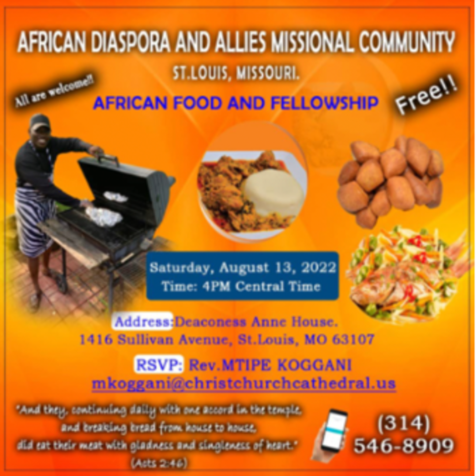 African Diaspora and Allies Missional Community will host an African Food and Fellowship event at the Deaconess Anne House Old North St. Louis. The event is scheduled on Saturday, Aug. 13, and will begin at 4 p.m.