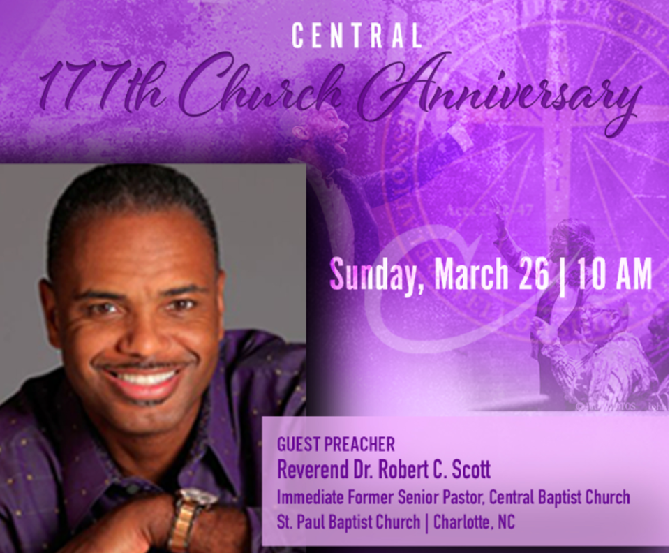 Central Baptist Church will celebrate its 177th Anniversary with Rev. Dr. Robert Scott on Sunday, March 26.