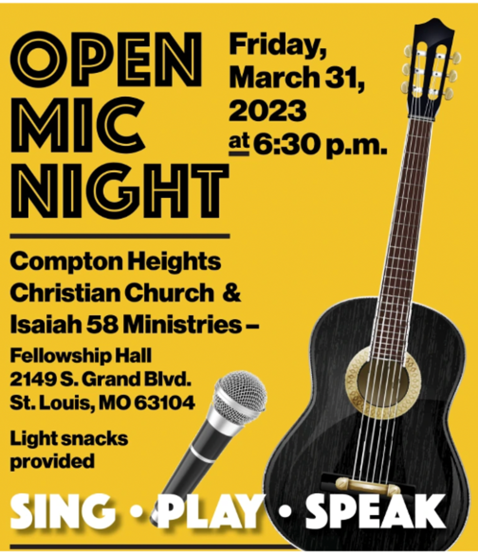 Compton Heights Christian Church (CHCC) will hold an Open Mic Night on Friday, March 31, at their Fellowship Hall at 6:30 p.m.